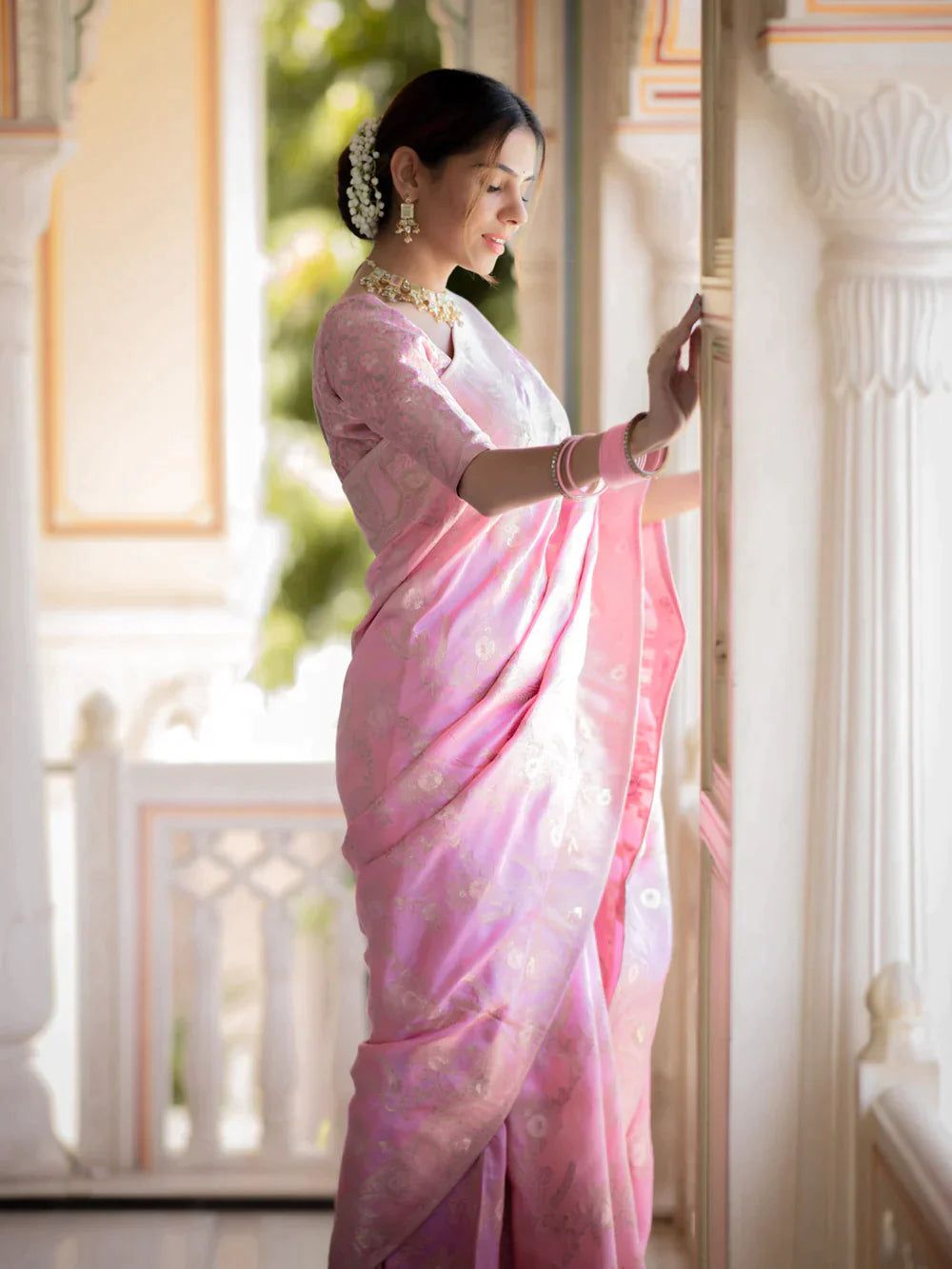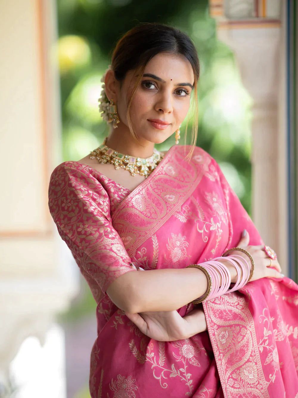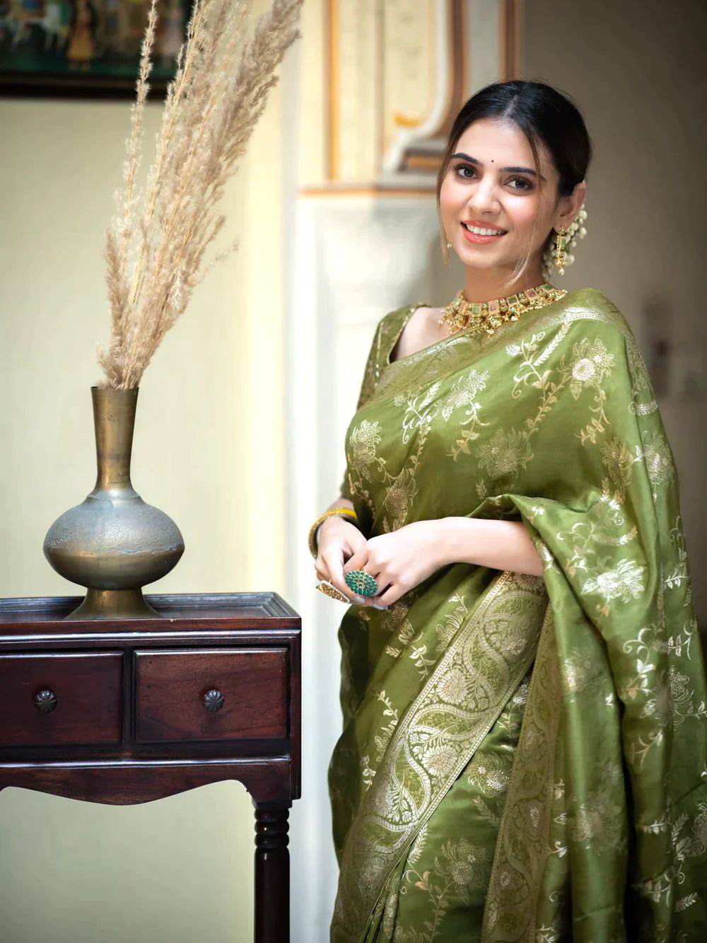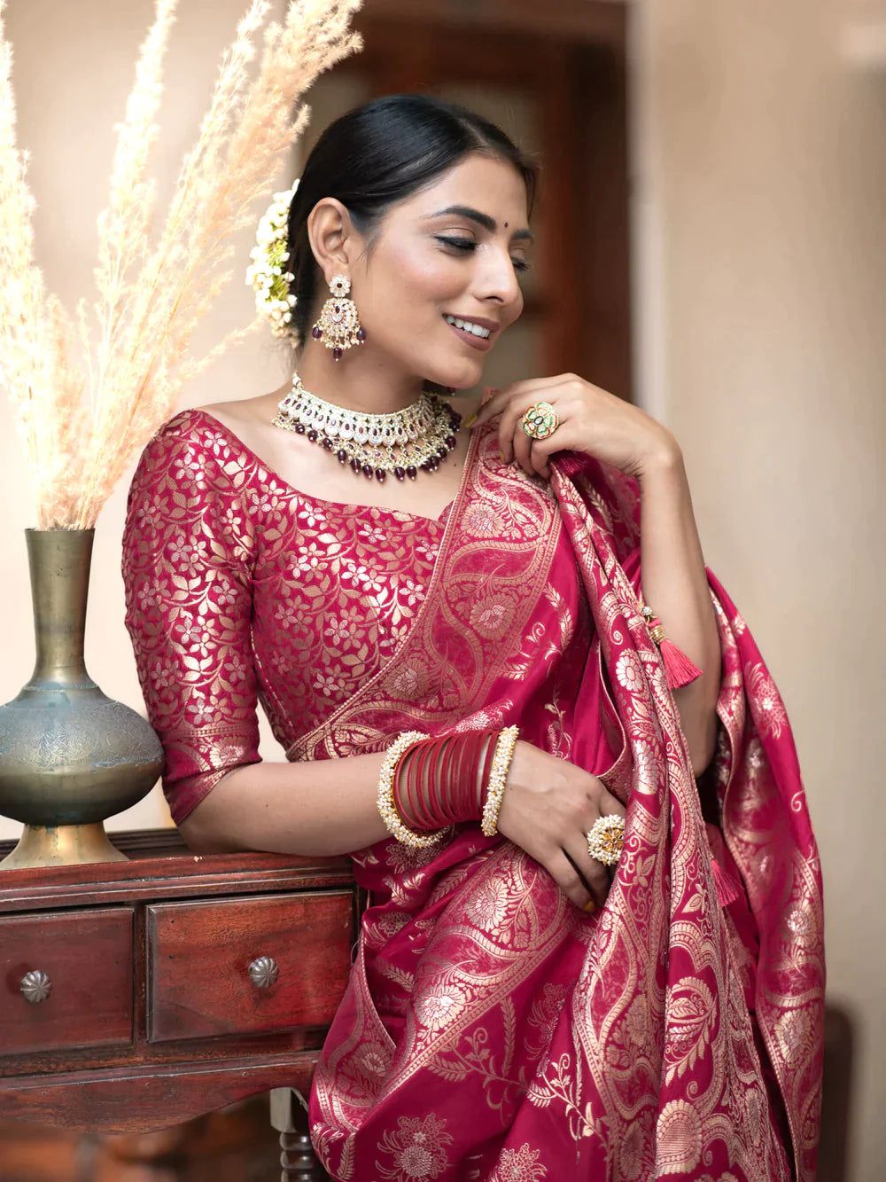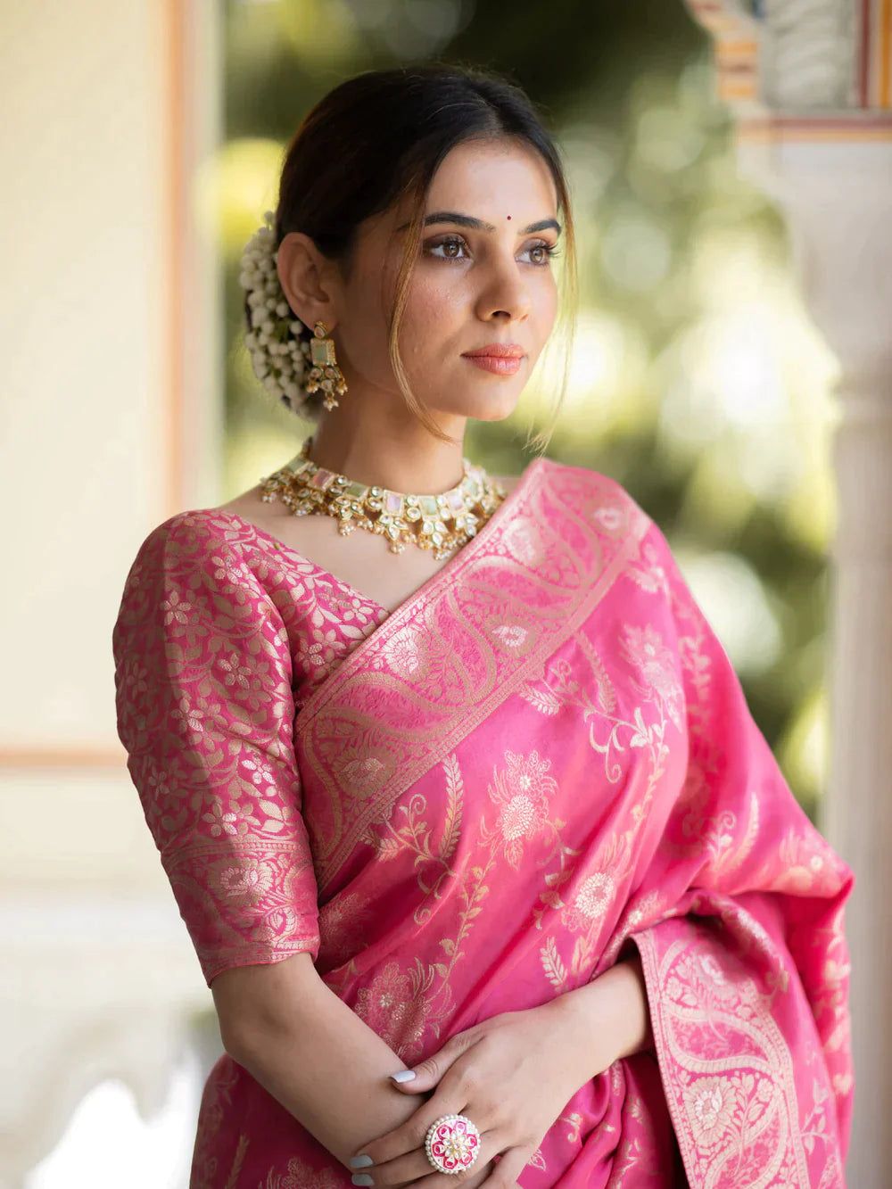 Enhance your ethnic wardrobe with this Premium Banarasi Silk Saree, crafted to reflect timeless elegance and royal charm. Made from soft, lustrous silk, this saree features intricate zari weaving all over, complemented by a rich and graceful pallu that adds a luxurious finish.