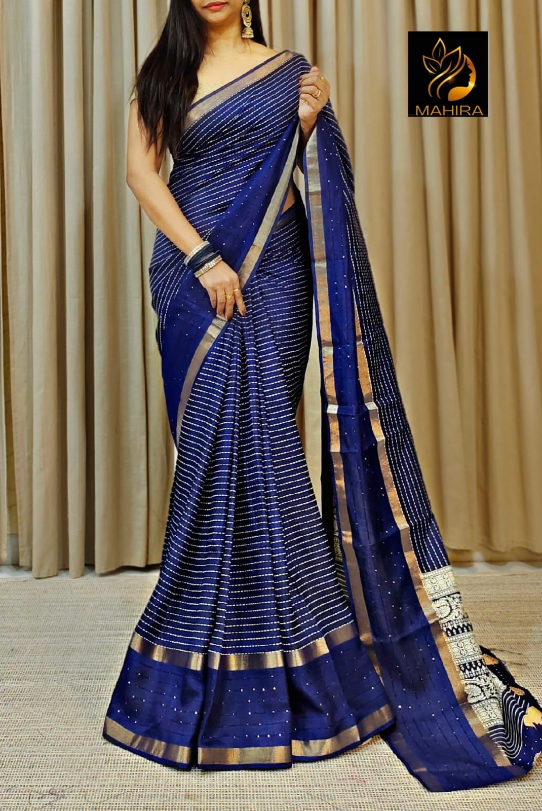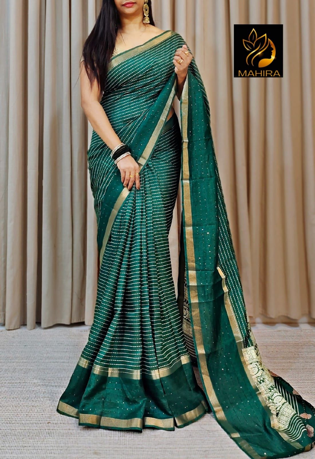 The saree is beautifully enhanced with a heavy zari weaving and sequin work border, adding a touch of glamour to its traditional design. Its smooth texture and graceful drape ensure comfort throughout the day. Paired with a matching running printed blouse, this saree is perfect for festive occasions, parties, cultural events, and stylish day functions.