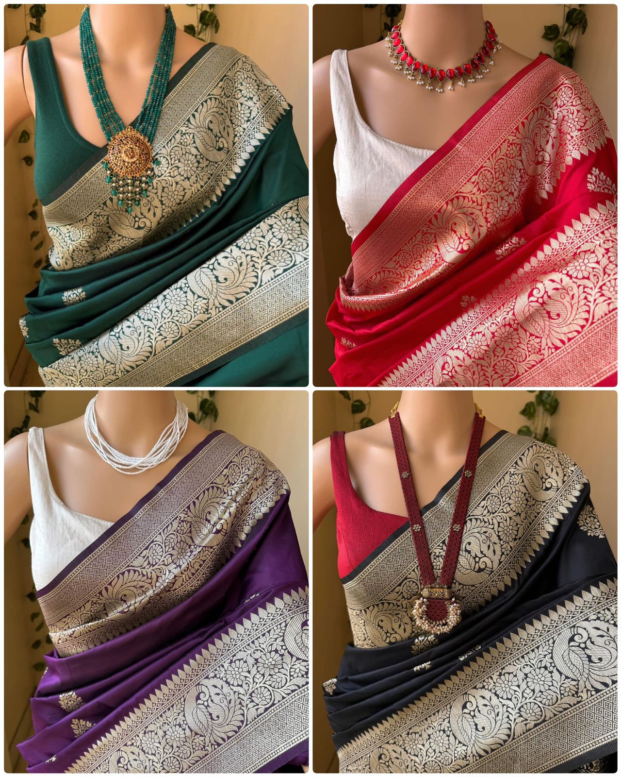 With an ultra-light weight of just 400 grams, it offers an effortless drape and easy movement, making it ideal for intimate weddings, daytime functions, and festive gatherings. The timeless Banarasi appeal uplifts your ethnic look while keeping you relaxed throughout the celebration.